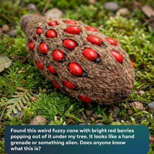 A strange fuzzy cone with bright red seeds found in the yard is likely a magnolia seed pod. As it matures, the cone-like structure splits open to reveal vivid red seeds that dangle briefly before falling. Though unusual in appearance, it is completely natural and part of the tree’s reproduction process, not a fungus or harmful organism.